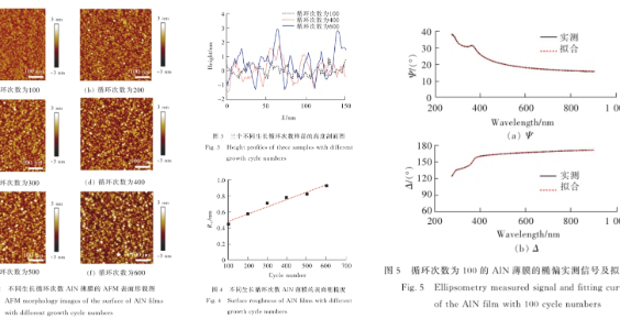 研究采用原子层沉积(ALD)工艺在硅衬底上生长了35 nm以下不同厚度的超薄氮化铝(AlN)晶态薄膜。利用椭圆偏振光谱法在275 nm~900 nm波长范围内测量并拟合薄膜的厚度及折射率、消光系数等光学参数。利用原子力显微镜(AFM)表征AlN晶粒尺寸随生长循环数的变化,并计算得到薄膜表面粗糙度用于辅助椭偏模型拟合。针对ALD工艺特点建立合适的椭偏模型,可获得AlN超薄膜的生长速率为0.535 Å/cycle,ALN超薄膜的折射率随着生长循环数的增加而增大并逐渐趋于稳定,薄膜厚度为6.88 nm时其折射率为1.6535,薄膜厚度为33.01 nm时其折射率为1.8731。该模型为超薄介质薄膜提供了稳定、可靠的椭偏法表征。