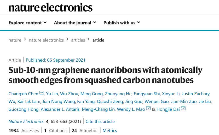 近日,上海交通大学电子信息与电气工程学院微纳电子学系陈长鑫研究组在窄的边缘光滑的石墨烯纳米带(GNR)的制备及其高性能晶体管应用研究方面取得了重要进展。研究成果以“Sub-10-nm graphene nanoribbons with atomically smooth edges from squashed carbon nanotubes(来自被压扁碳纳米管的边缘原子级光滑的亚10纳米石墨烯纳米带)”为题在Nature Electronics期刊上发表。