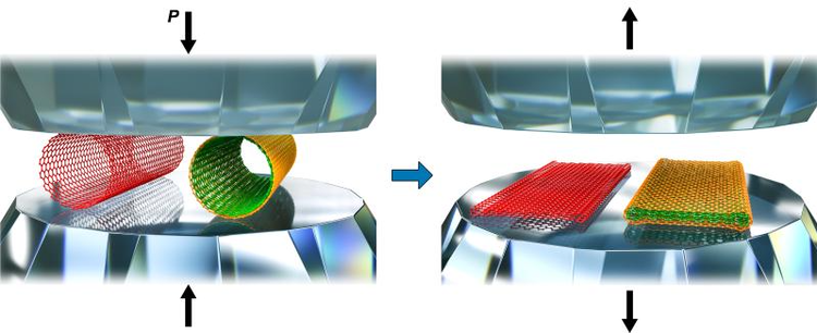 图1. 通过高压和热处理将单壁和双壁CNT(左图)压扁成为边缘闭合的双层和四层GNR(右图)的示意图(来源:Nature Electronics)