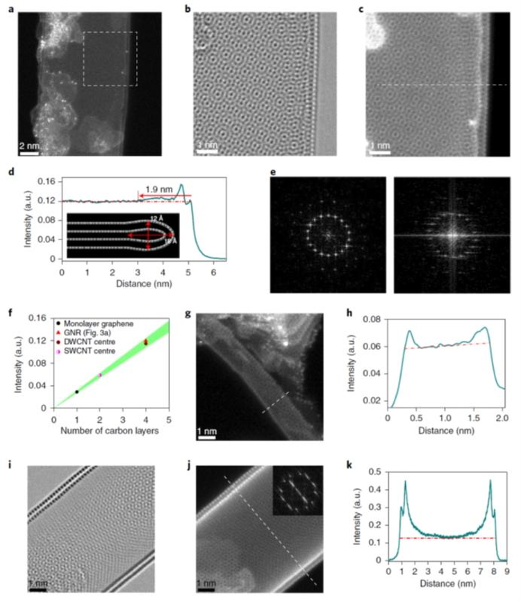 图2. 制备的GNR和CNT原料的扫描透射电子显微镜原子分辨图像和表征(来源:Nature Electronics)