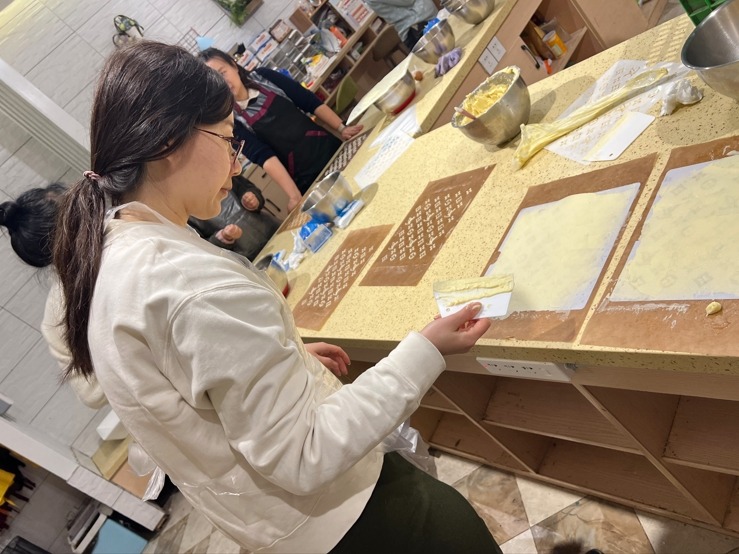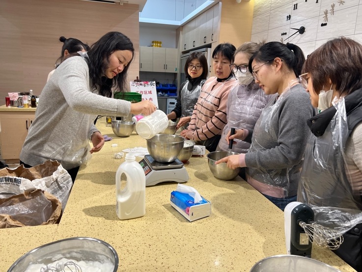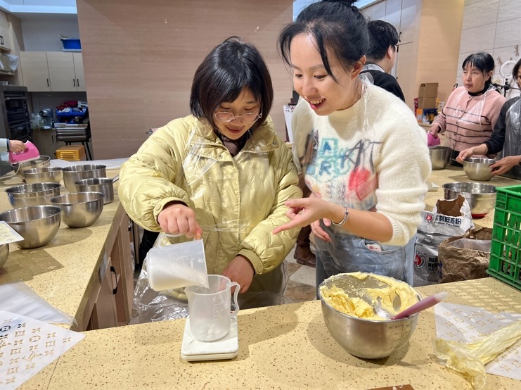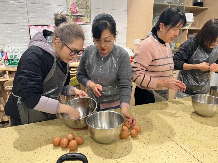 分离蛋清蛋黄、打发、搅拌、烘烤、脱模、反卷……女老师们俩俩分组,默契配合,在烘焙老师的悉心指导下化身“甜品大师“,干劲儿十足。