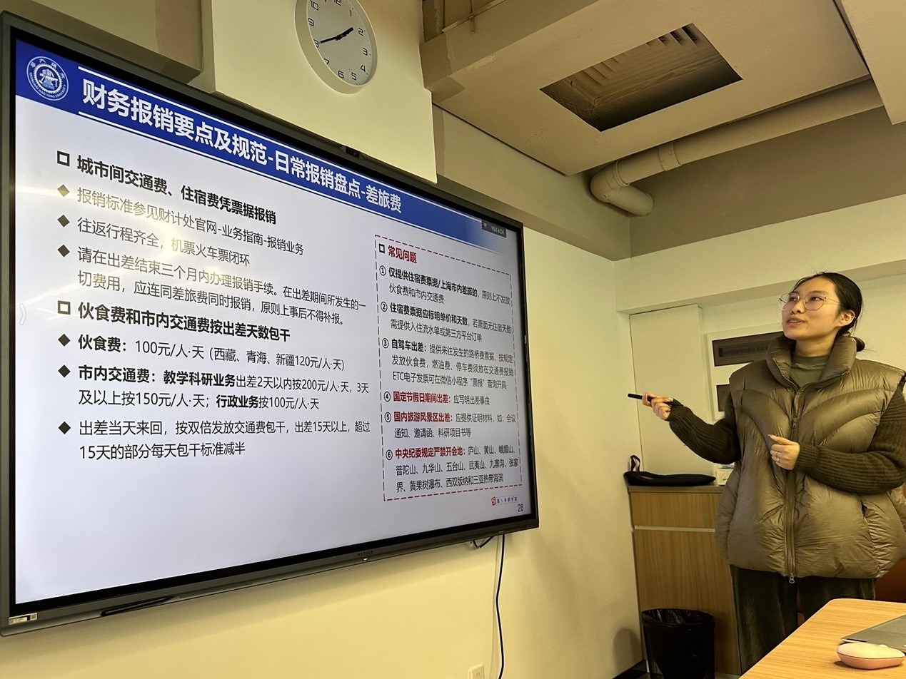 培训内容涵盖平台整体架构介绍、政策及规章制度宣贯、学校财务报销及招采流程宣贯、文稿撰写等四个部分。行政部主管韩晓佳率先作了详细的讲解,系统介绍了平台整体架构及运作模式,宣贯了平台的核心政策及规章制度,为新教职工厘清了工作思路。行政助理宋天欣对学校财务报销和招采流程进行了深入剖析,通过案例展示和实操指导,帮助与会者掌握具体操作方法。最后,党支部书记刘毓闻结合实际工作需求,生动讲解了文稿撰写的技巧与注意事项,为新教职工的日常工作提供了宝贵经验。