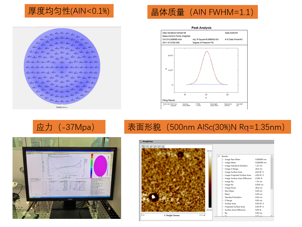 该设备是一台高度集成的多腔室磁控溅射设备,专为研发和制备高性能的微电子/声学器件(如BAW滤波器、SAW器件、MEMS传感器等)而设计。共有4个工艺腔室,包含AlN薄膜溅射腔室、AlScN薄膜溅射腔室、金属Mo溅射腔室,以及对薄膜进行离子束精细磨平修整的腔室。设备的核心用途是制备以氮化铝(AlN) 和钪掺杂氮化铝(AlScN) 为关键功能材料的压电薄膜器件。因溅射沉积的薄膜表面可能不够平整,粗糙的表面会严重损害高频器件的性能(如增加损耗),离子束修平腔室可以将其磨得极其平整。