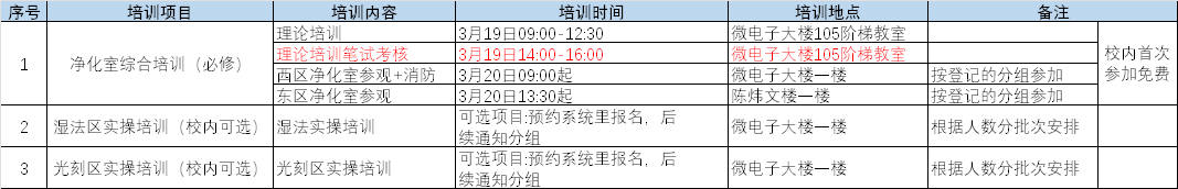 1) 理论培训:平台介绍、净化室规范、化学品安全、消防安全、湿法理论培训、测试设备介绍、预约系统操作培训。