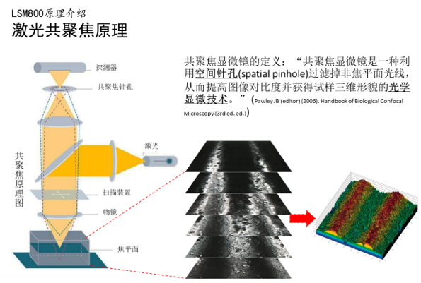 共聚焦显微镜是一种利用空间针孔(spatial pinhole)过滤掉非焦平面光线,从而提高图像对比度并获得试样三维形貌的光学显微技术。该设备可以对样品进行三维空间结构上的无损伤观察,比如三维结构、多层薄膜、凹面或凸面等不规则表面的观察及成像处理。