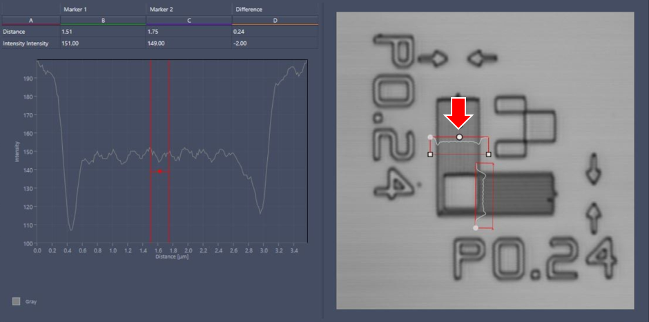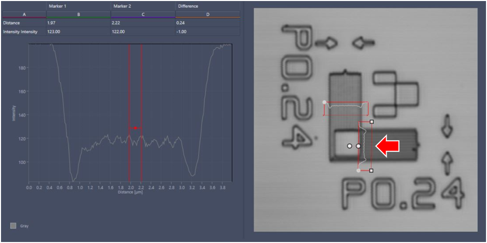 2.宽度测试重复性测试:对于2μm宽度的条纹标准样品,宽度测量可重复性≤10nm,测试条件为:50X物镜,3AU,0.10μm步进,2014×512像素,重复测量10次,取灰度半高宽为条纹宽度。