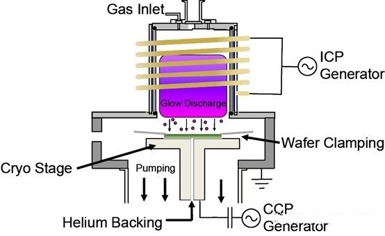 ICP-RIE(电感耦合等离子体-反应离子刻蚀)是将ICP与反应离子刻蚀(RIE)技术相结合的先进技术,旨在提高刻蚀速率、高选择性和低损伤刻蚀。由于等离子体可以保持在低压下,因此还提供了出色的轮廓控制。 首先,ICPRIE系统引入特定的刻蚀气体,然后将射频电源(通常是13.56MHz)引入一个导体线圈,这个线圈通常位于等离子反应室顶部,和反应室的气体分隔开来。当射频电源通过导体线圈时,会在导体周围产生震荡的电磁场。这个震荡的电磁场能量通过感应耦合的方式传递给反应室中的气体,导致气体分子中的电子被激发并从原子中解离出来,形成自由电子和正离子。这些自由电子在电磁场中继续获得能量,并且与更多的气体分子碰撞,导致更多的电子被解离,形成高密度的等离子体。