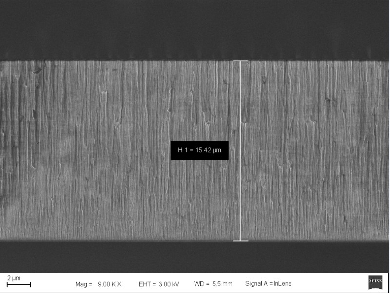沉积温度65℃制备厚度15.4微米,超厚二氧化硅薄膜,薄膜无开裂,无形变,无孔洞,有晶向。