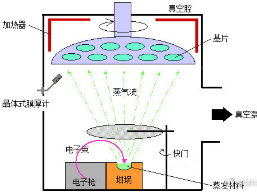 利用钨灯丝发射的热电子经阴极与阳极间的高压电场加速并聚焦,由磁场使之偏转到达坩埚待蒸发材料表面,轰击材料引起晶格振动,释放热量,直至材料熔化或升华,将材料蒸发沉积。