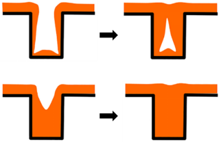 上图,当使用普通镀液电镀填充深孔时,会在填充过程中形成空隙。下图,TSV电镀中,由于添加剂的协同作用,铜在顶部的沉积速率低于底部沉积速率,即铜“bottom-up”超级填充。